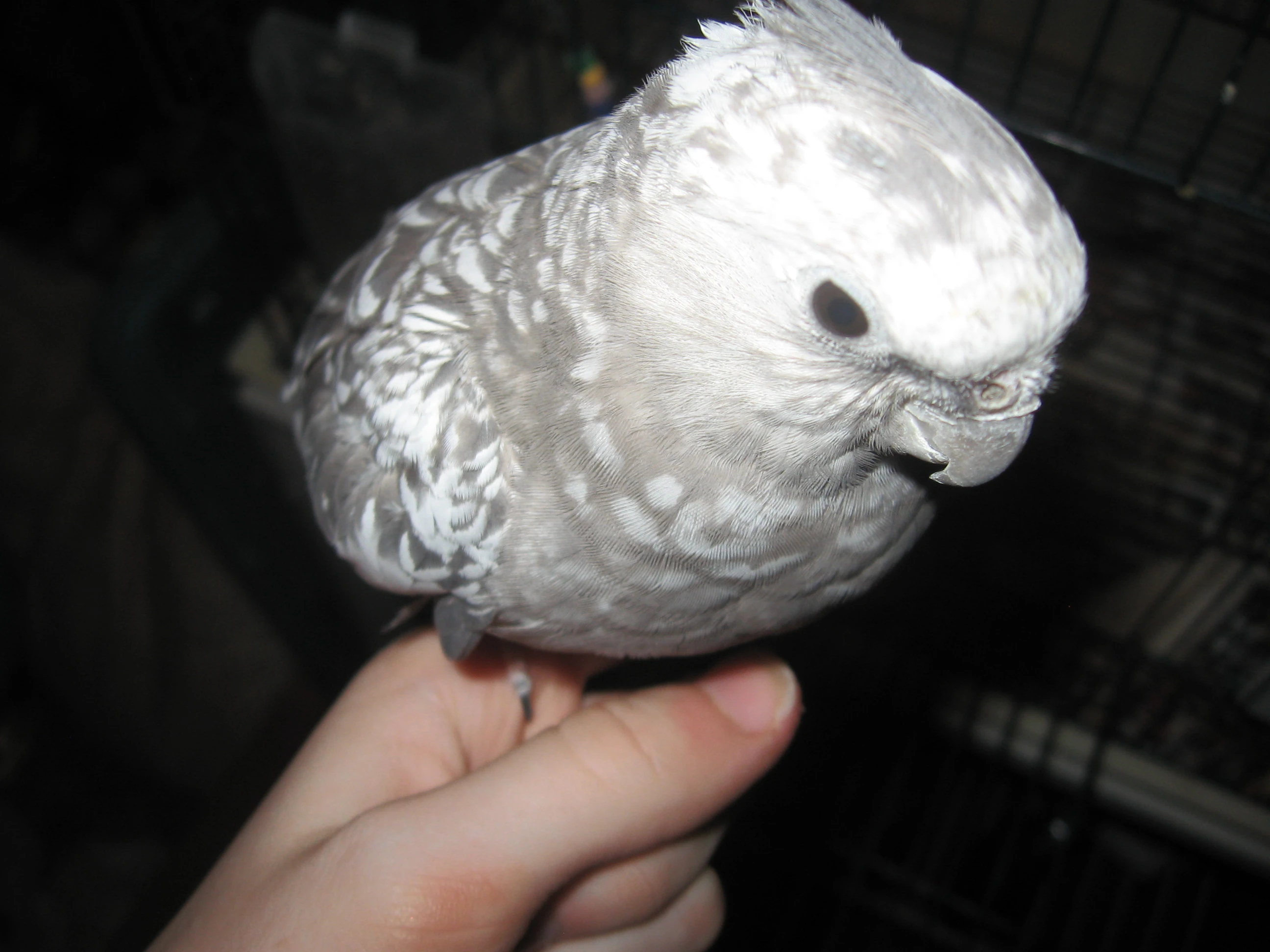 Stormy is a white-faced pearl cockatiel. She resembles Sunny, except she is grey and white.